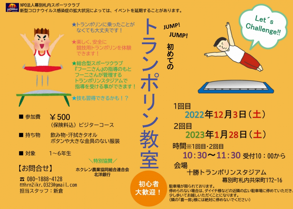 こちらも、トランポリンクラブ「フーニ」さんのお力を借りますが、講師の稗田氏は、弊クラブの指定管理事業も手伝ってくれています