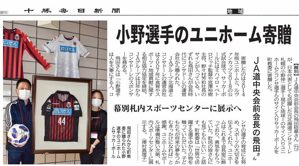 その、小野伸二選手のコンサドーレ時代のユニフォームが、札内スポーツセンターに展示されることになりました