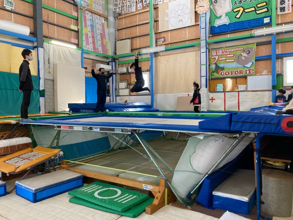 この種目ができるのは、わが町に「トランポリンスタジアム」という特殊な施設と、「フーニ」の稗田マネジャーがおられるからこそ