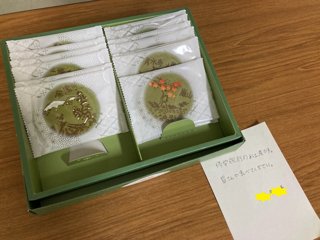 昨年度の3年生もそうでしたが、先日、修学旅行のお土産が置いてありました