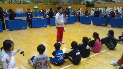 普段見たことの無いフェンシングの道具に子どもたちは興味津々![]()