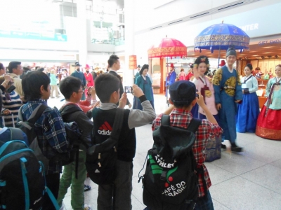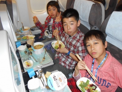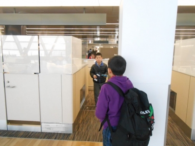 当然、国際便。子どもたちも一人ひとり出国検査を受けます。最初の緊張の時間