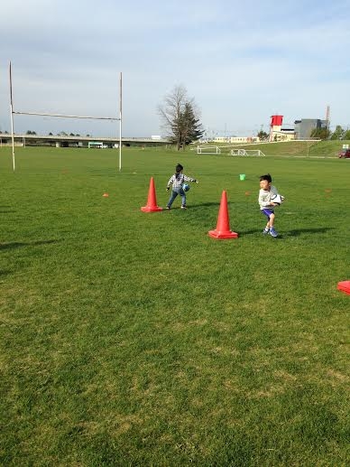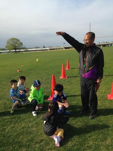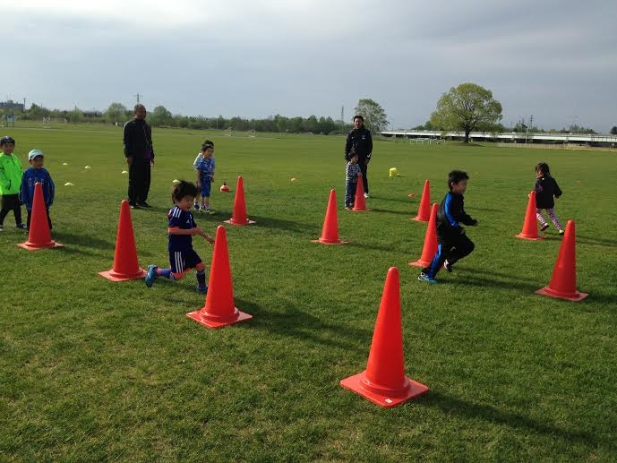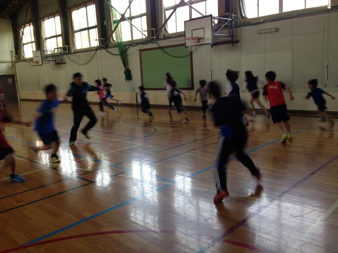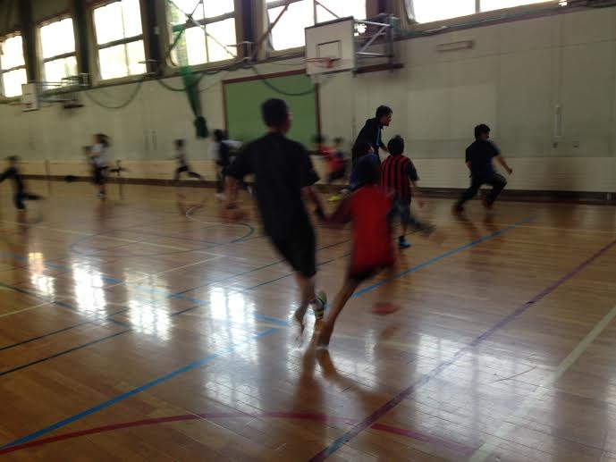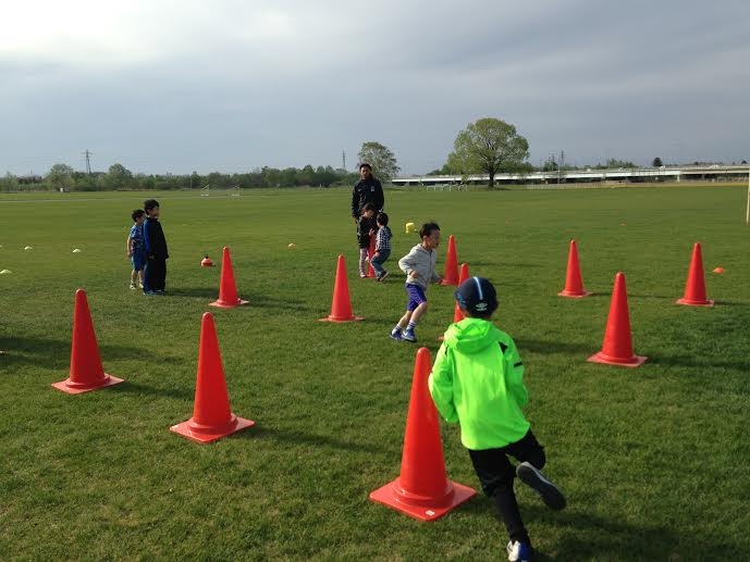 まず、最初に初回なので交流を兼ねて「手つなぎオニ」をしました。コーチがおにとなり子供たちには沢山走ってもらいました![]()