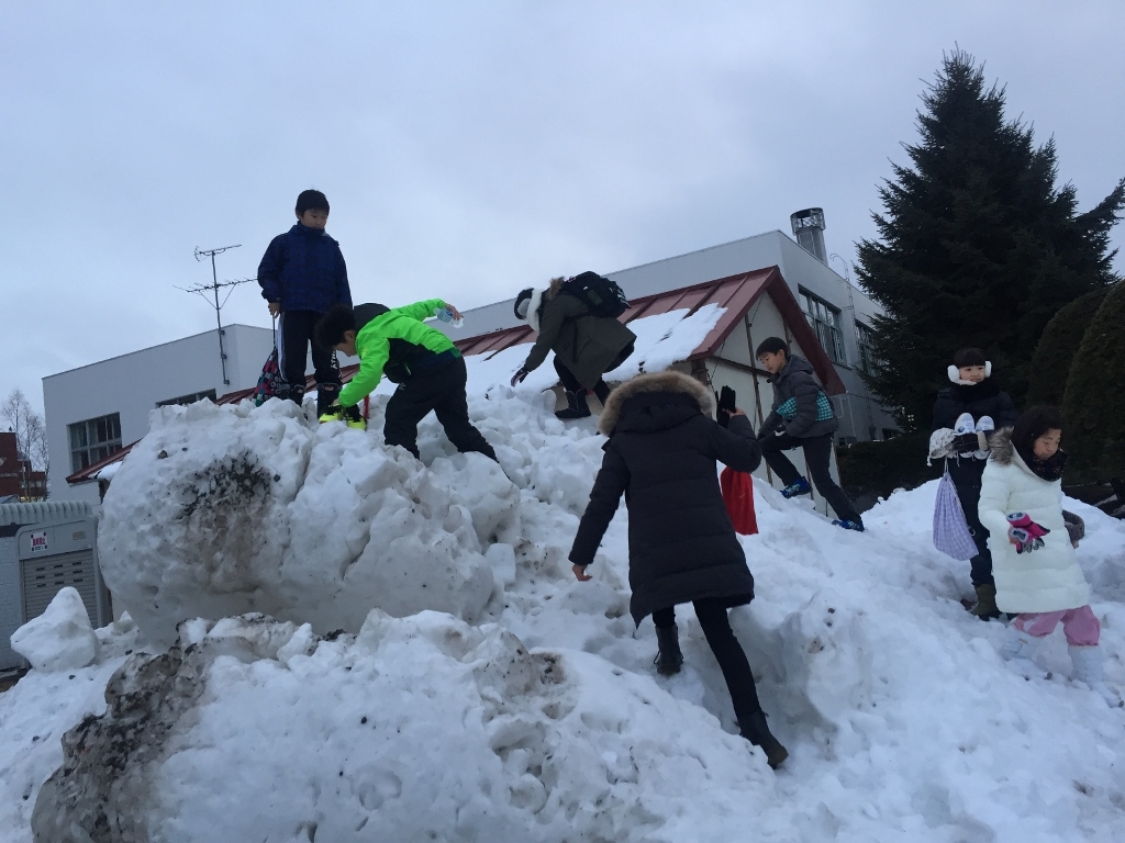 インドアスタジアムの外の雪山に感動する大分っ子たち!北海道民にとっては当たり前の雪山も大分の子どもたちにとては新鮮みたいです!