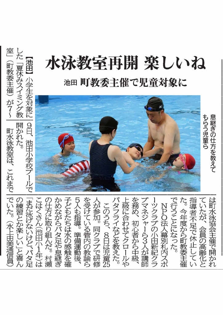 今年から隣町の池田町からお話をいただき、私たちにとっても初めてとなる「夏休み水泳教室」を3日間担当させていただきました